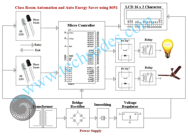 The Classroom Automation and Auto Energy Saver project is a microcontroller-based system designed to monitor the number of people inside a room and automatically control electrical appliances such as lights and fans to reduce energy wastage. The system uses the AT89S52 microcontroller to continuously count the number of people entering and leaving the room through a sensor system installed at the doorway. Based on the count of people present inside, the system automatically switches appliances ON or OFF.